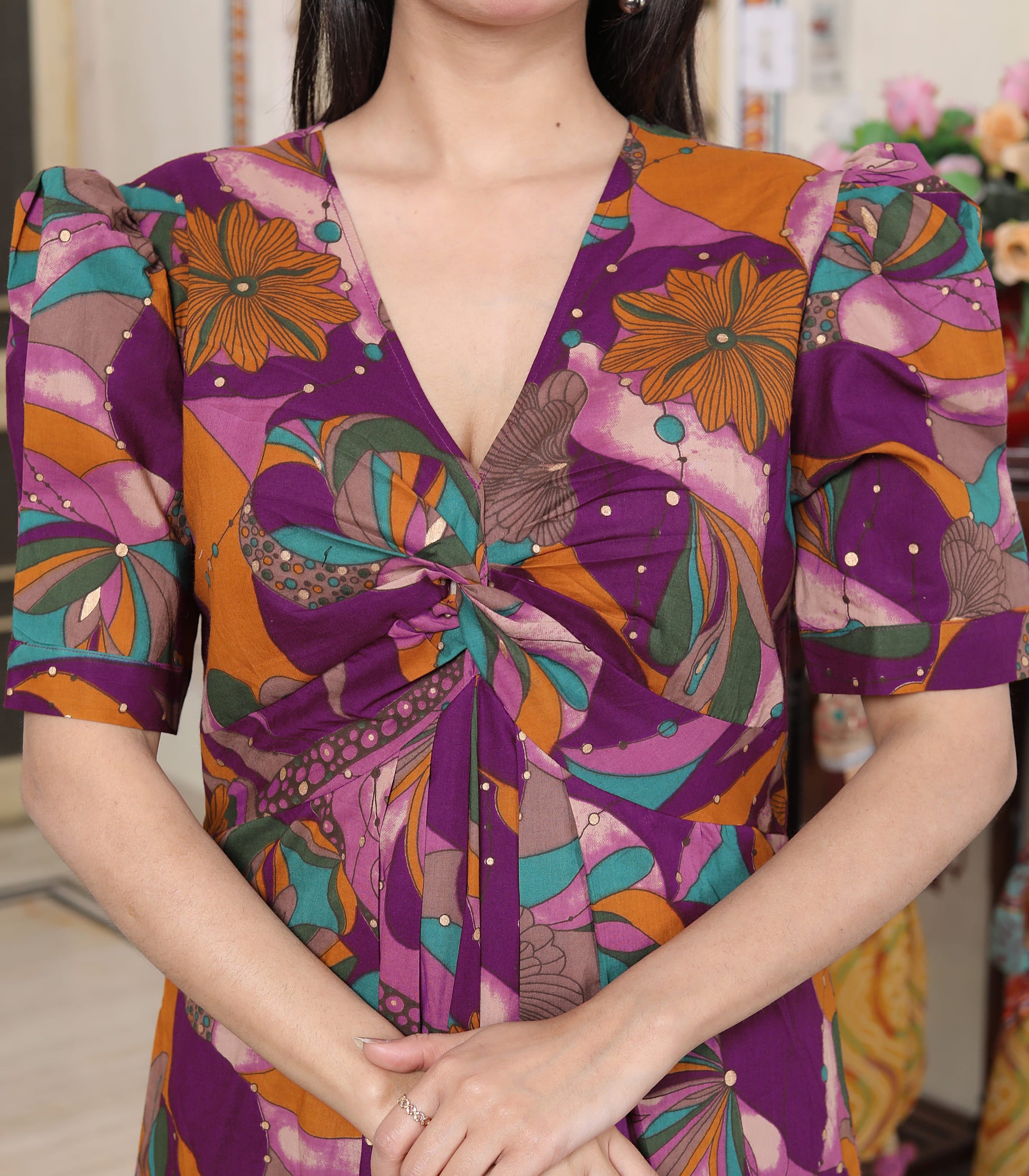 A Very beautiful floral print magenta Half Puff sleeves, V Neck midi dress fabricated with premium cotton fabric, the outfit is design for summer and good to go for any wear Ocassion. It is sure to fetch you from all. Embrace The Trendy Style With This Butterfly Style Dress From Miravan. Pair It With Trendy Footwear To Complete Your Ensemble.
