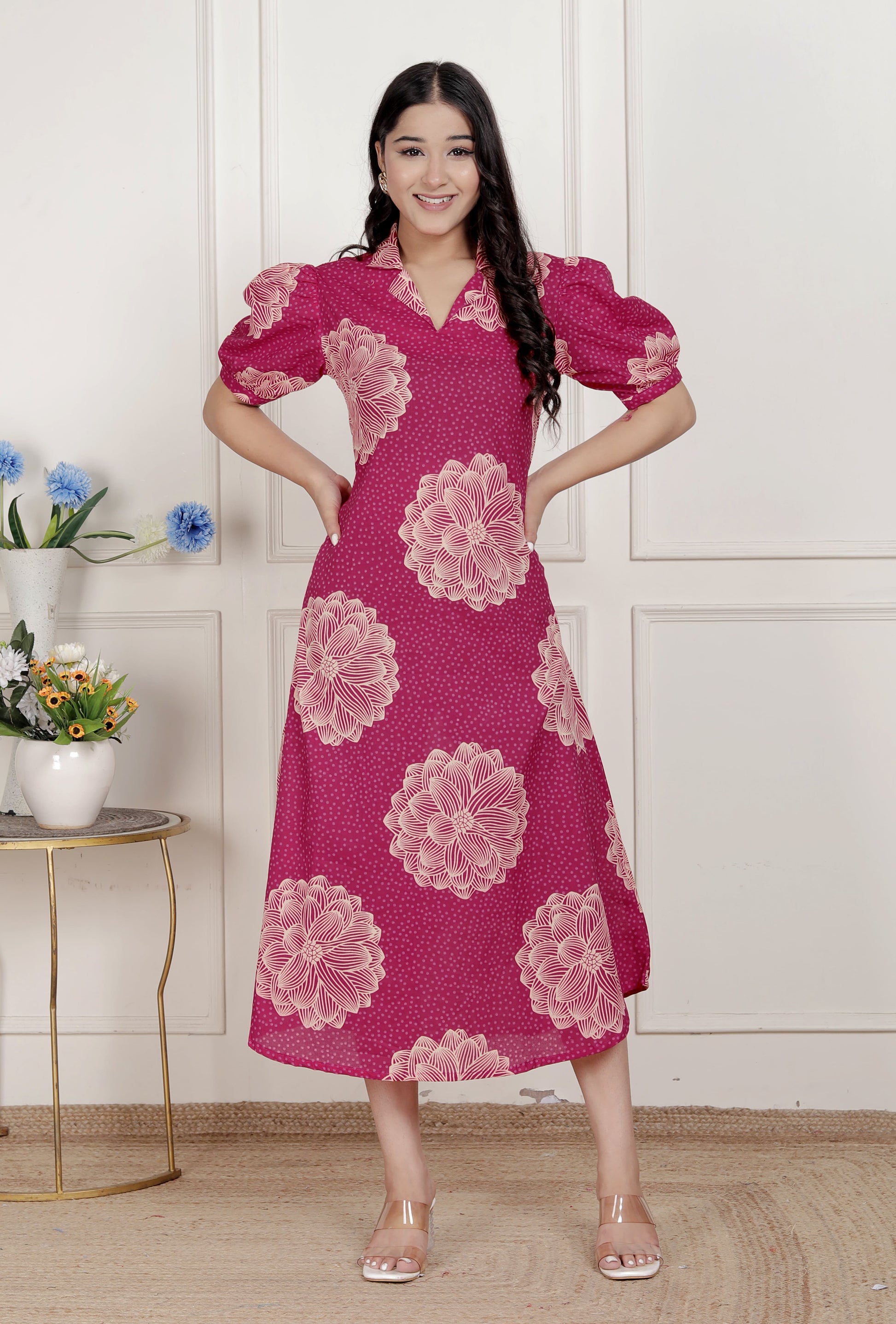 Miravan Womens Pink Printed Collar Neck Short Puff Sleeves Cotton A-Line Maxi Dress