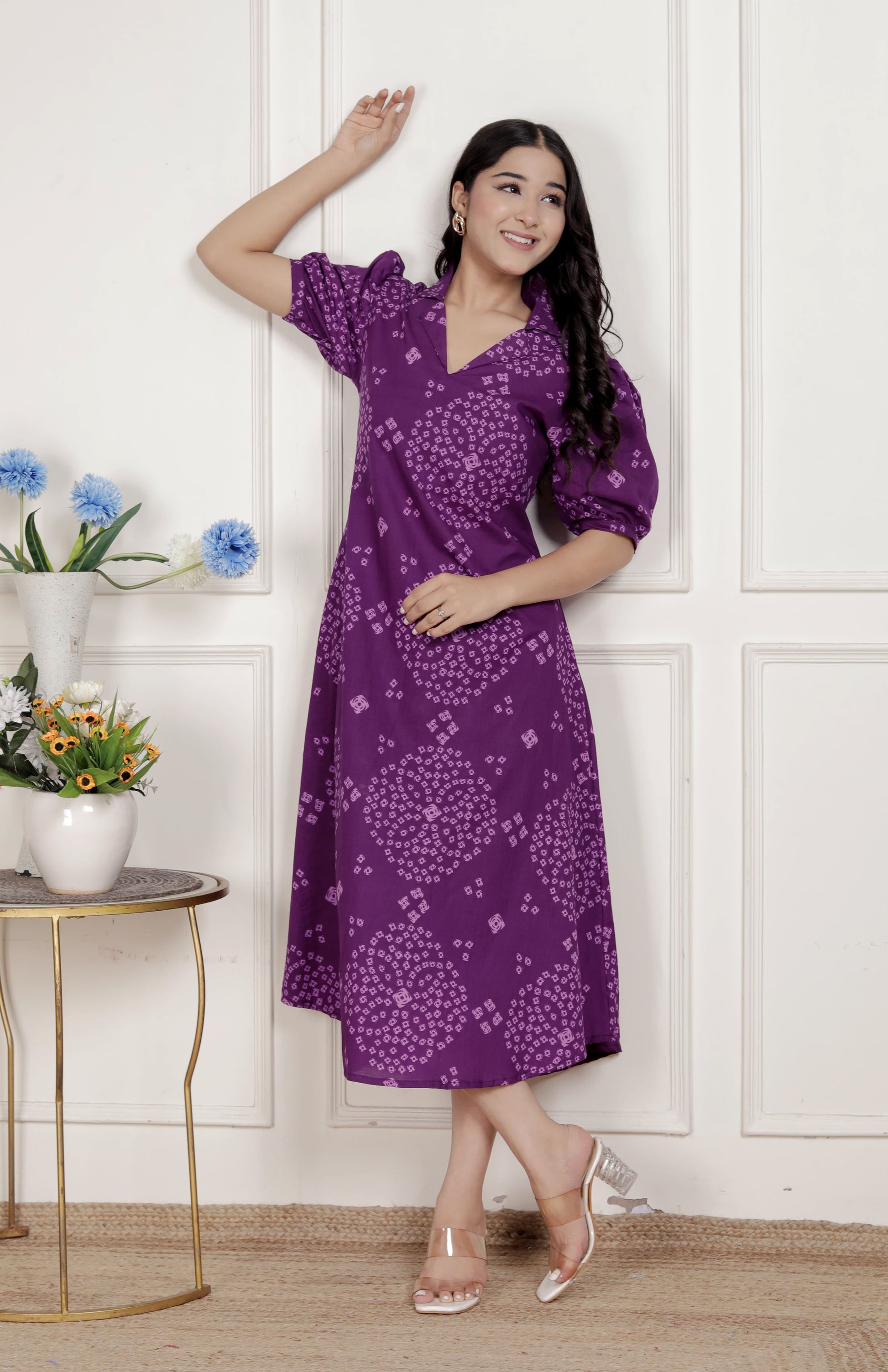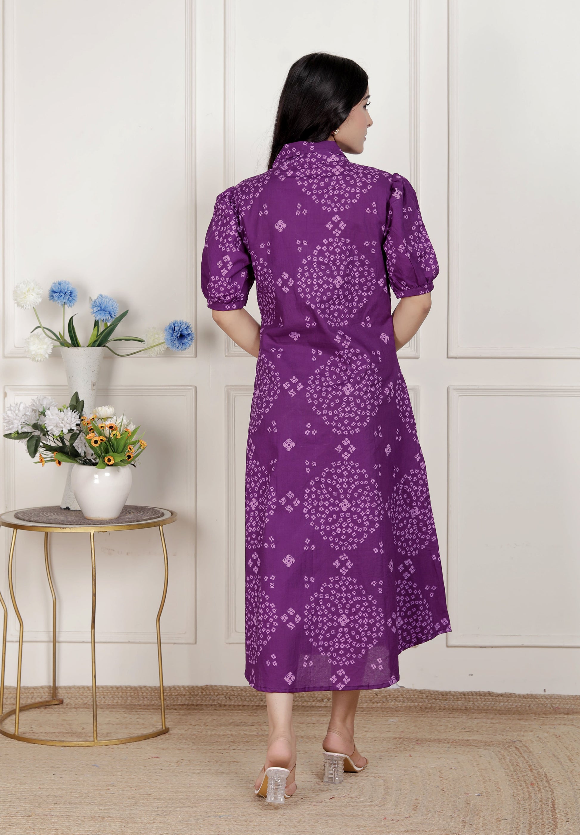 Stay stylish with this Purple dress from miravan. Made from high quality cotton, it features pull on closure and Bandhani printed along with half sleeves & Collar neck design. Pair it with sneakers with minimal jewellery to complete your ensemble.