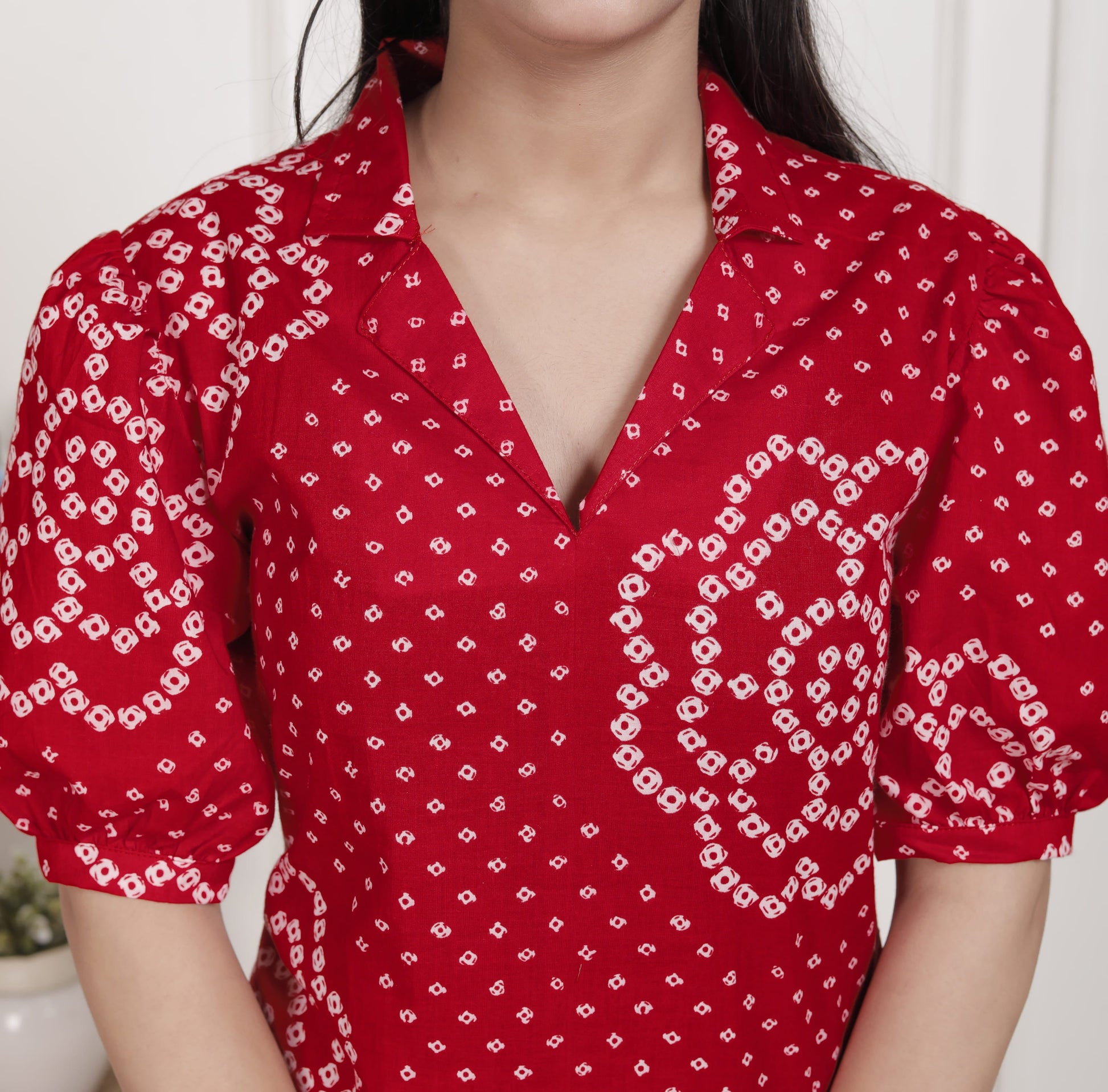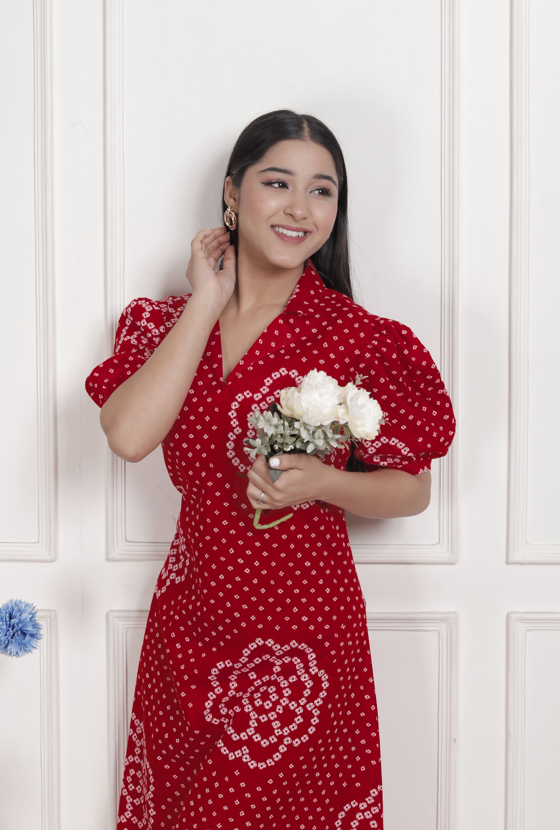 Miravan Womens Red Bandhani Printed Collar Neck Midi Dress