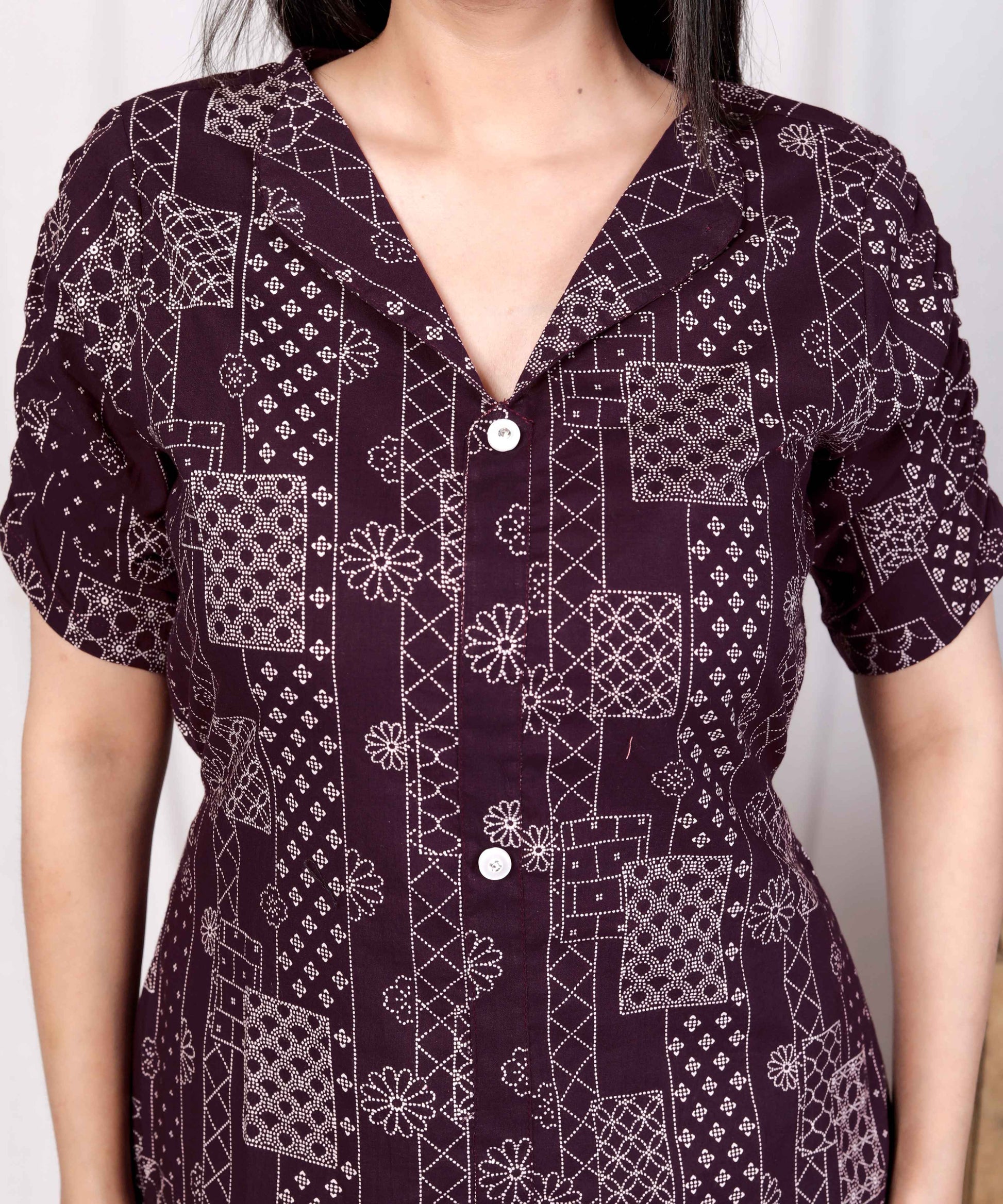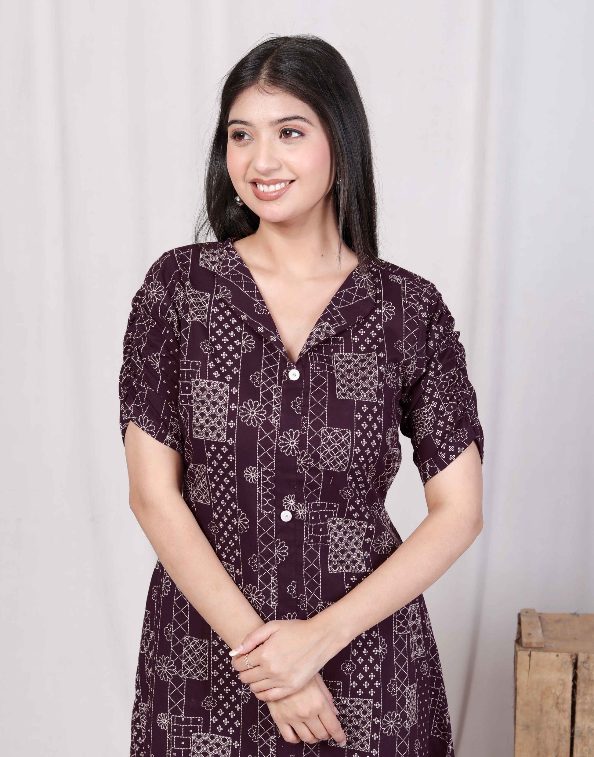This Wine A-Line Floral Print Dress from Miravan exhibits Collar Neck & Half Sleeves, Button Closure. A Wine Maxi Dress With An Floral Print And Dress Back Side Dori Tie Up Like A Chic And Stylish Choice! The Calf Length Offers A Balance Between Elegance And Comfort, While The Floral Print Adds Visual Interest And A Touch Of Artistic Flair To The Garment.