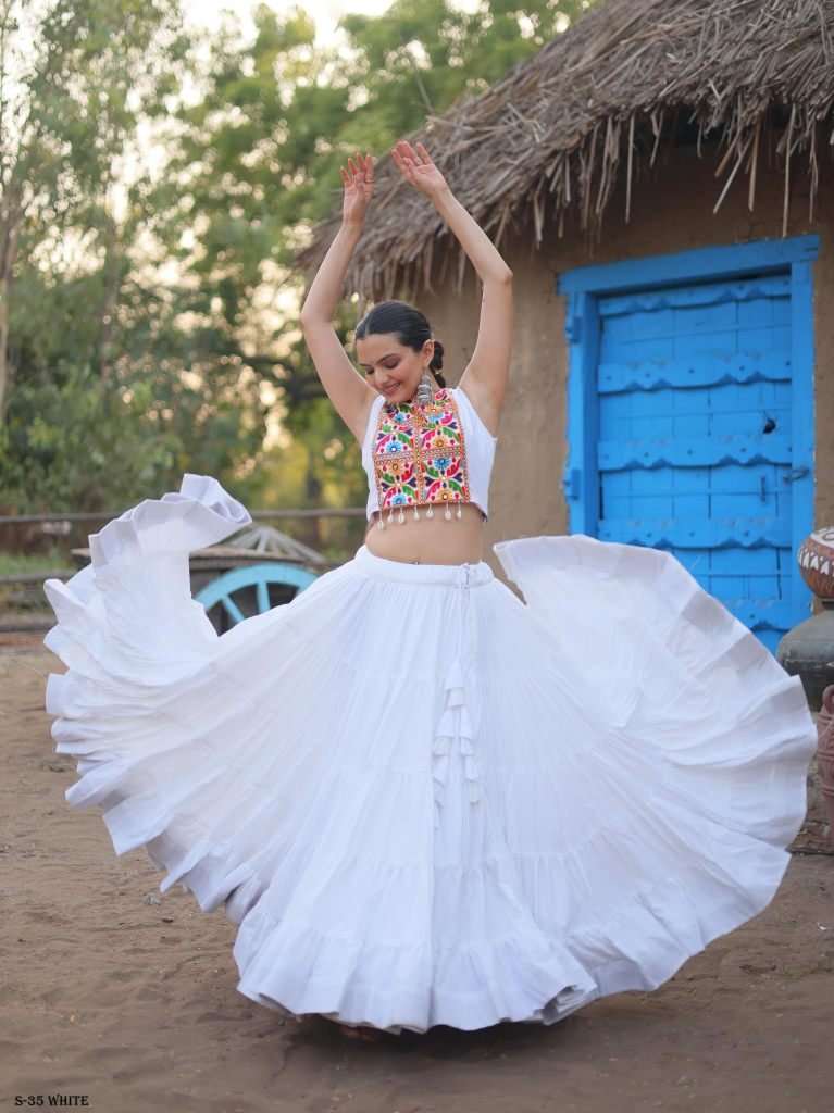 New Rayon White Ready Made Navratri Lehenga Blouse Koti Set